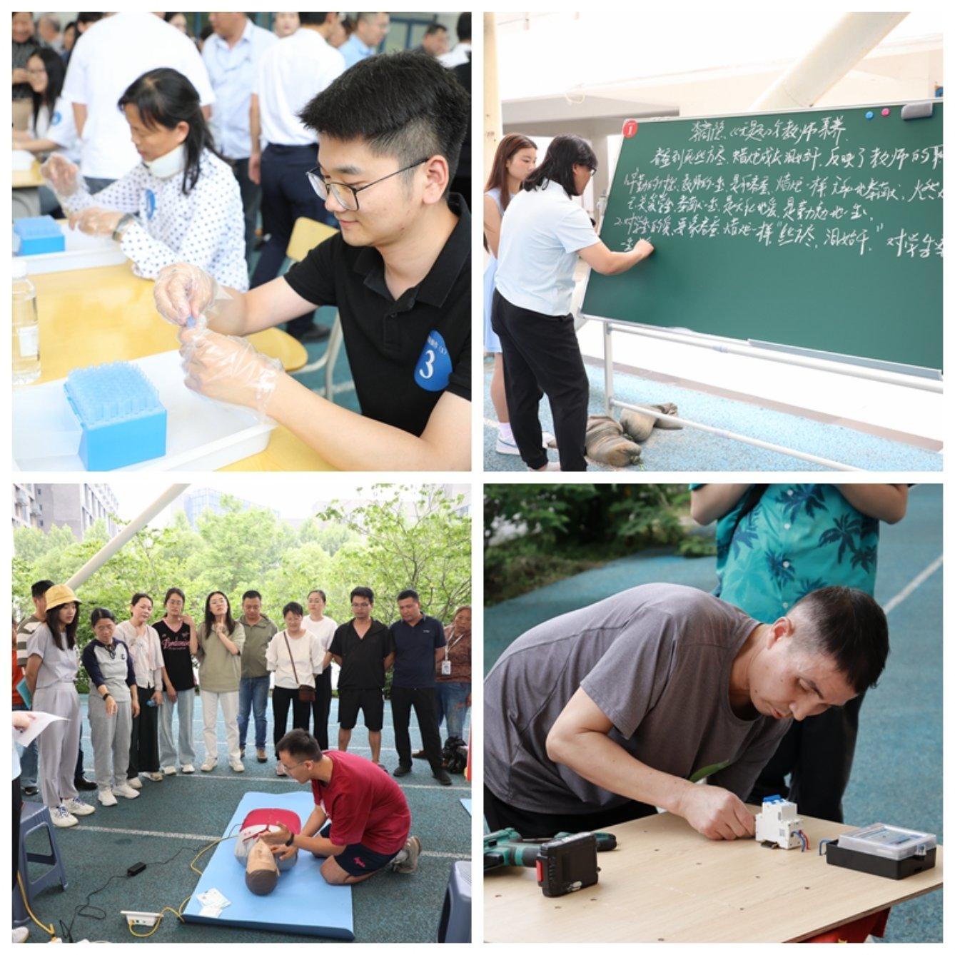 活動現場氣氛熱烈,亮點紛呈。在板書書寫區,老師們筆鋒遒勁、布局精巧,展現了“三尺講臺育桃李”的師者匠心;在實驗操作區,“點亮‘五一’”項目要求選手精準連接線路、制作燈牌,考驗專業技能與審美能力,戴手套插槍頭,比拼的是選手的速度與精準;急救技能考場內,單人心肺復蘇操作規范嚴謹,彰顯生命教育的溫度;運輸技能賽場熱火朝天,拆裝輪胎與倒車移庫環節盡顯教職工“硬核實力”;餐飲技能區香氣四溢,參賽選手以刀工如飛、火候精準的技藝奉獻味覺盛宴;創意手工區上的剪紙、手工作品栩栩如生,將傳統技藝與現代創意完美融合;AI+教育教學案例展示則凸顯了前沿科技與教育實踐的深度融合。