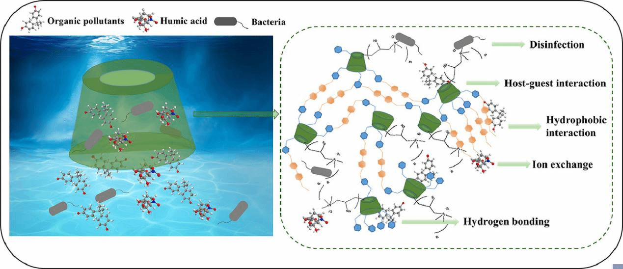 團隊研發多功能多孔β-環糊精聚合物用于水質凈化。水環境中的多種污染物對人類健康和生態安全構成嚴重威脅。其中,內分泌干擾物、持久性有機污染物(POPs)、抗性素等有毒有機新污染物給水環境和人類健康帶來風險,受到人們普遍關注。同時,水體中的天然有機物(NOM)不僅造成水體色嗅味感官指標的惡化,還是消毒副產物的前驅體,也影響其他有機和無機污染物的去除,給水處理帶來嚴峻挑戰。此外,水體中的病原微生物是水傳播疾病爆發的主要原因,也是水處理工藝重點控制目標物。目前,污水處理廠對有機污染物和微生物的去除往往需要兩個或多個工藝的耦合,工序繁瑣,增加了工程建設投資和運營成本。所以,迫切需要開發一種簡單的凈化材料及水處理工藝,以實現對水體中微污染物、天然有機物和病原微生物的同時去除。課題組研究團隊研制了季銨化環糊精基樹脂新材料,可高效吸附去除水體中常見的雙酚A (BPA)等有毒有機污染物和腐殖酸(HA)等天然溶解性有機物,對水中大腸桿菌等病原微生物兼有優良的滅/抑菌作用。研究結果以“Multifunctional porous β-cyclodextrin polymer for water purification”為題在Water Research(2022, 222: 118917)上發表。