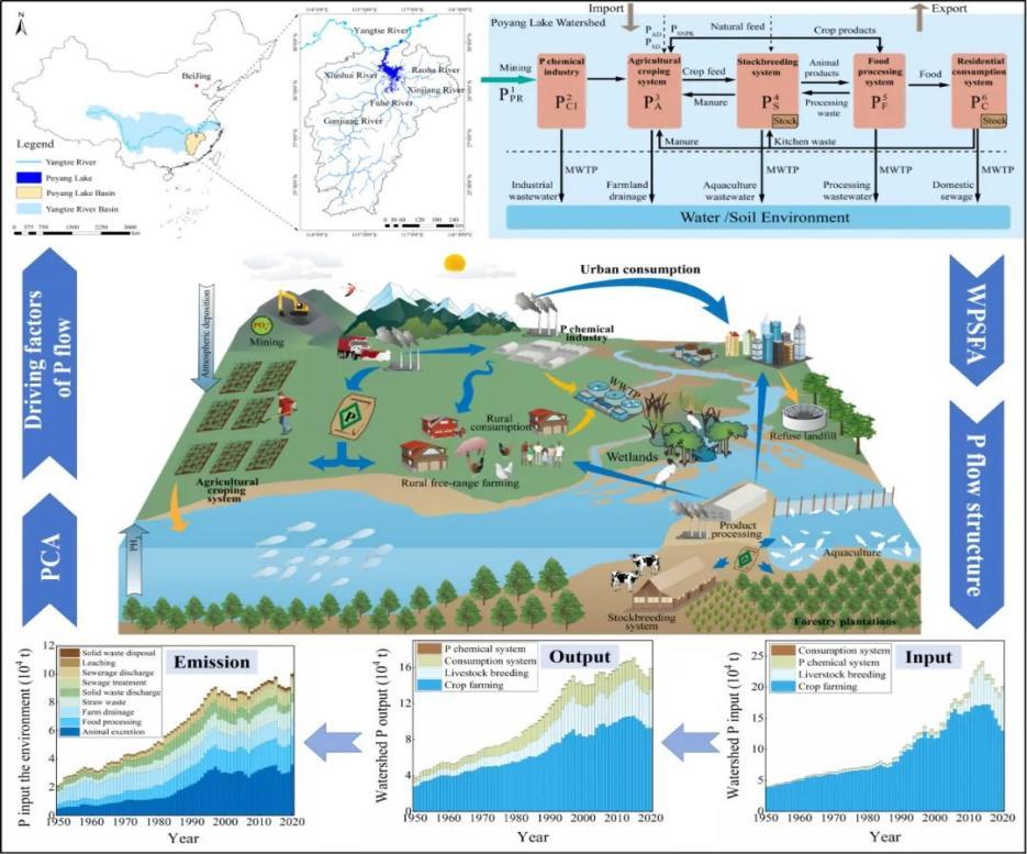 團隊研發自下而上的流域尺度磷物質流模型,分析1950-2020年鄱陽湖流域中磷元素的物質流動特征。隨著全球社會經濟持續快速發展,每個國家和地區對磷資源需求都顯著增加。社會系統中磷的過度開發和低效利用,不僅嚴重消耗全球有限磷礦資源,還造成全球性水體富營養化問題。了解大型流域內磷(P)的物質流動循環及其代謝過程對于全球磷資源的可持續利用和控制水體富營養化至關重要。為此,課題組研究團隊研發了自下而上的流域尺度磷物質流模型,分析1950-2020年鄱陽湖流域中磷元素的物質流動特征。研究結果以“Analyzing the phosphorus flow characteristics in the largest freshwater lake(Poyang Lake)watershed of China from 1950 to 2020 through a bottom-up approach of watershed-scale phosphorus substance flow model”為題在Water Research(2023, 245:120546)上發表。