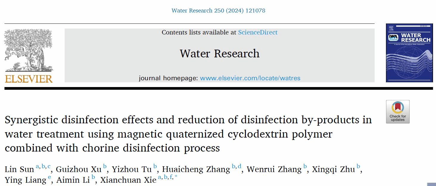 團隊研究磁性季銨化環糊精基樹脂與氯消毒工藝耦合的協同消毒效果及其對消毒副產物削減作用。污水消毒對保障水質安全至關重要。傳統的氯消毒工藝因其簡單、高效而被廣泛使用。但是,氯消毒過程中會產生大量有毒有害的消毒副產物(DBPs),對生態環境和人類健康造成嚴重威脅。為此,課題組研究團隊研制了磁性季銨化環糊精基樹脂材料,與氯消毒工藝進行耦合,研究耦合工藝的協同消毒效果及其對消毒副產物削減作用,研究結果以“Synergistic disinfection effects and reduction of disinfection by-products in water treatment using magnetic quaternized cyclodextrin polymer combined with chorine disinfection process”為題在Water Research(2024, 250:121078)上發表。