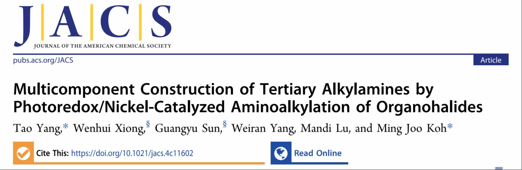 本網訊(化學化工學院)近日,我校化學化工學院楊濤教授課題組與新加坡國立大學Koh Ming Joo(許民瑜)教授團隊合作,在化學頂級期刊Journal of the American Chemical Society上以“Multicomponent Construction of Tertiary Alkylamines by Photoredox/Nickel-Catalyzed Aminoalkylation of Organohalides” 為題在線發表最新研究成果。南昌大學楊濤教授為論文的第一作者,楊濤教授和新加坡國立大學Koh Ming Joo 教授為共同通訊作者,南昌大學為第一通訊單位。