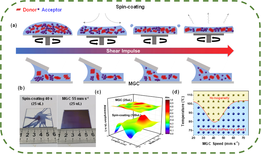 有機太陽電池(OSCs)作為一種富有光明前景的可再生太陽能利用方法,因其重量輕、靈活性好、成本低等優勢受到學術和商業領域的廣泛關注。但由于印刷工藝的差異和材料的聚集形態限制,大面積綠色印刷器件效率仍不盡人意。我校陳義旺教授和胡笑添研究員團隊采用剪切沖量策略對非鹵代溶劑(鄰二甲苯,o-XY)處理的活性層薄膜進行形貌微調,通過抑制給受體材料的過度聚集成功印刷(半月板刮涂,MGC)制備性能優異的大面積有機太陽電池器件及模組。并將該印刷策略與準平面異質結三元策略和封裝工藝(仿生界面層)相結合,通過降低光學損失成功印刷制備防水性能優異的大面積有機光伏窗戶。此外,團隊總結了近年來綠色溶劑處理有機光伏器件的研究進展,并討論了溶劑選擇策略及相關優化策略(添加劑策略、三元策略、預聚集策略、共溶劑策略以及印刷制備策略等)在有機光伏器件綠色印刷制備中的應用。