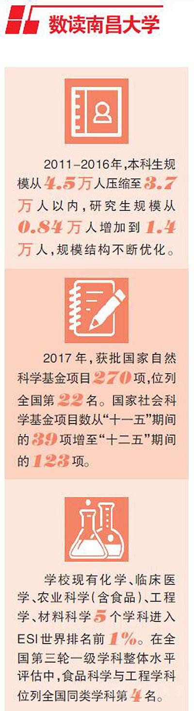 在國(guó)家啟動(dòng)高等教育“雙一流”戰(zhàn)略的重大機(jī)遇面前,南昌大學(xué)提出“育人為本,創(chuàng)新驅(qū)動(dòng),實(shí)干興校,拼爭(zhēng)一流”的工作方針,并及時(shí)制定《南昌大學(xué)建設(shè)高水平大學(xué)實(shí)施方案》,明確要努力建設(shè)一流學(xué)科、一流專業(yè)、一流平臺(tái),提供一流服務(wù)。