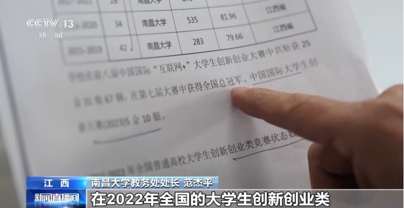 南昌大學(xué)教務(wù)處處長(zhǎng) 范杰平:很多學(xué)生從原來僅僅關(guān)注學(xué)業(yè)成績(jī),還更關(guān)注創(chuàng)新創(chuàng)業(yè)能力,比如他可以從事一些論文,一些實(shí)驗(yàn)比賽,比如說全國(guó)普通高校大學(xué)生競(jìng)賽排行榜,在2019年的時(shí)候,我們排在42位,到2022年,到了22位,在2022年全國(guó)的大學(xué)生創(chuàng)新創(chuàng)業(yè)類競(jìng)賽狀態(tài)數(shù)據(jù)排在第五名,對(duì)于南昌大學(xué)這種地方高校確實(shí)非常不容易的。