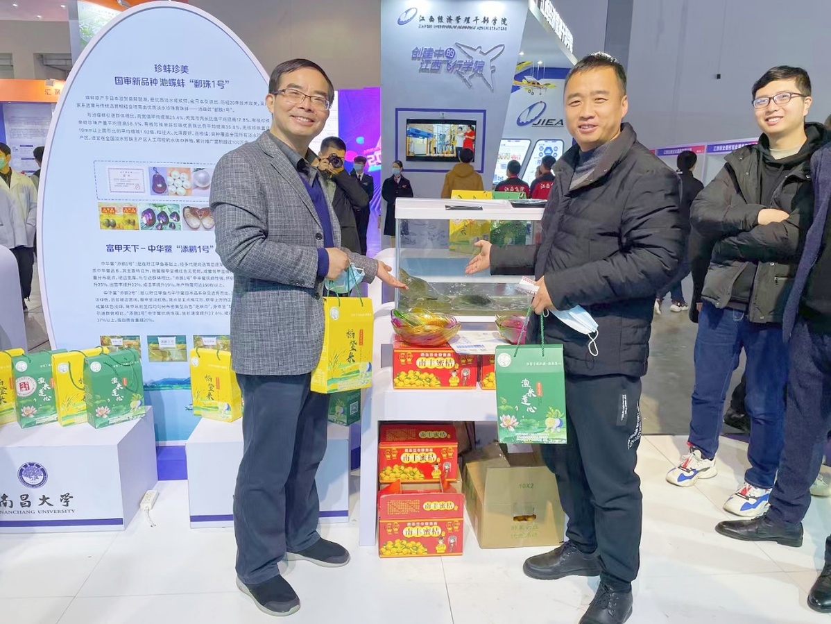 12月11日至12日,江西省第三屆高??萍汲晒麑訒谀喜G地國際博覽中心A3、A4館盛大開幕,南昌大學共計百余項科技成果、實物參展。珍蚌珍美團隊也攜多年培育的最新科研成果精彩亮相對接會,展示了科技創新、創新創業、產教融合等方面的成就。