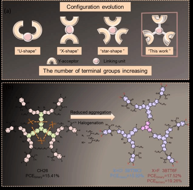 諶烈提出了一種非稠環骨架星形三聚體巨分子策略,通過碳碳單鍵來打破分子平面性,為電荷轉移和傳輸提供三維傳輸途徑。重要的是,非熔融骨架策略不僅可以顯著提高分子溶解度和產率,還可以有效抑制分子過度聚集,通過優化成膜工藝和電荷動力學,基于3BTT6F的二元器件獲得了17.52%的光電轉換效率,三元器件的效率高達19.26%。該工作體現了非稠環三聚體巨分子的潛力,為實現高效和穩定的有機太陽能電池的構建提供了一條新途徑。