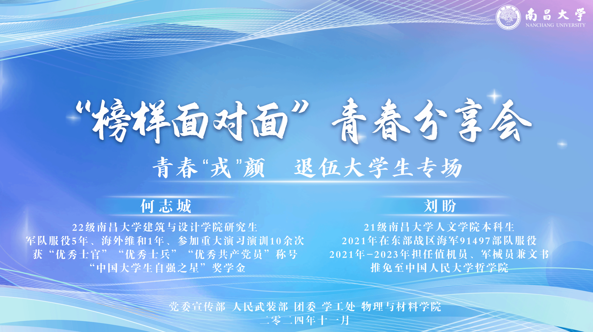 劉盼,21級南昌大學人文學院本科生,曾于東部戰區海軍91497部隊服役三年,服役期間,曾擔任值機員、軍械員兼文書,多次參加海上重大演習、海陸空聯合作戰演練等通信任務保障,退役復學后,以專業綜合測評第一名推免至中國人民大學哲學院。