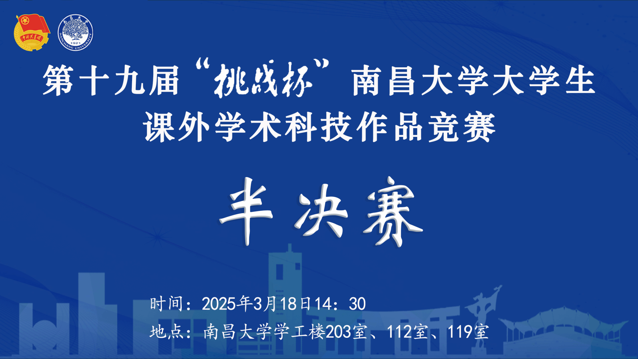 根據(jù)《關(guān)于舉辦第十九屆“挑戰(zhàn)杯”南昌大學(xué)大學(xué)生課外學(xué)術(shù)科技作品競(jìng)賽的通知》要求,經(jīng)過校級(jí)初賽、復(fù)賽兩輪評(píng)審,共評(píng)選出本次入圍半決賽的作品 114 件,其中科技發(fā)明制作類 40 件、哲學(xué)與社會(huì)科學(xué)類調(diào)查報(bào)告 35 件、自然科學(xué)類學(xué)術(shù)論文 39 件。本次半決賽將于本周二14:30采用線下現(xiàn)場(chǎng)路演的形式,由各項(xiàng)目團(tuán)隊(duì)依照抽簽結(jié)果向評(píng)審專家進(jìn)行3分鐘匯報(bào)展示。